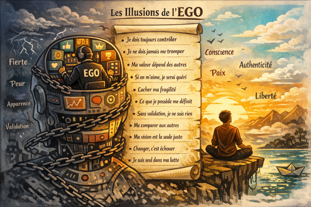 Voici 11 illusions courantes de l’ego que j’ai moi-même rencontrées, parfois combattues, souvent apprivoisées — et que je te propose d’observer non pas avec jugement, mais avec bienveillance.